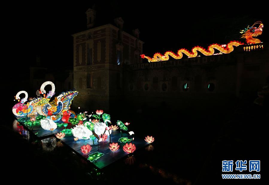这是12月15日在法国谢尔河畔塞勒市的塞纳古堡拍摄的中国彩灯。 首届“塞纳古堡彩灯嘉年华”活动日前在法国谢尔河畔塞勒市的塞纳古堡开幕,39组造型别致、色彩鲜艳的自贡彩灯为有着千年历史的塞纳古堡披上了别样的节日盛装。“塞纳古堡彩灯嘉年华”活动将一直持续到中国春节。 新华社记者 高静 摄