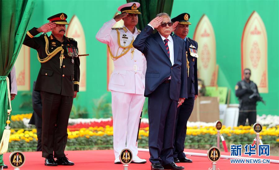 12月16日上午,孟加拉国首都达卡的国家阅兵场举行阅兵仪式。这是孟加拉国总统哈米德(左三)检阅部队。 新华社发