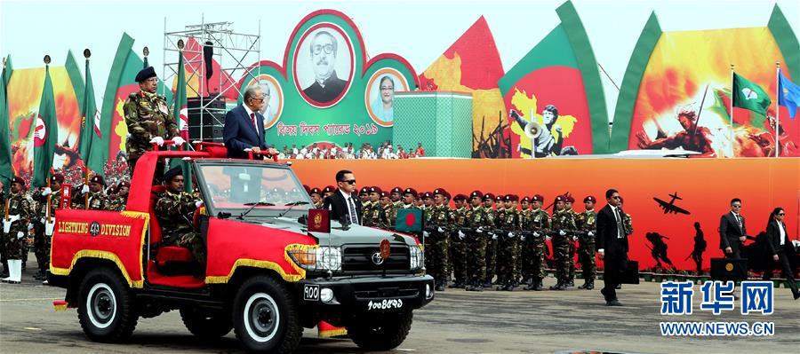 12月16日上午,孟加拉国首都达卡的国家阅兵场举行阅兵仪式。这是孟加拉国总统哈米德(车上左三)检阅部队。 新华社发