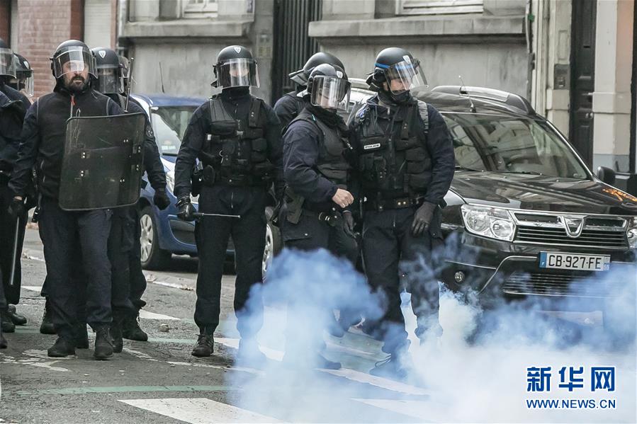 12月17日,在法国北部城市里尔,警察在示威游行现场警戒。 12月17日,法国反对政府改革退休制度的全国大罢工进入第13天,交通、教育等多个行业受到影响。 新华社发(塞巴斯蒂安·库尔吉摄)