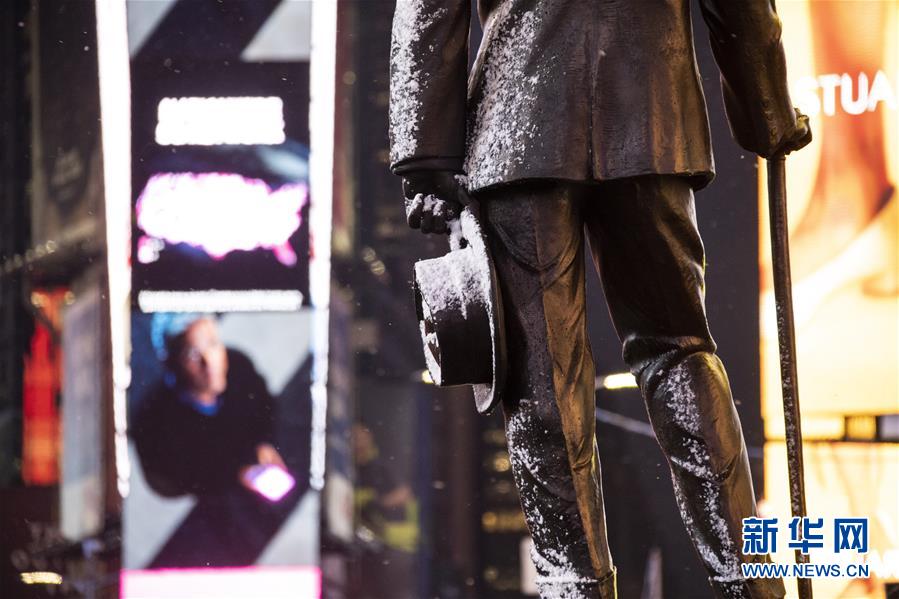 12月18日,美国纽约时报广场上的雕像落上积雪。新华社记者 王迎 摄