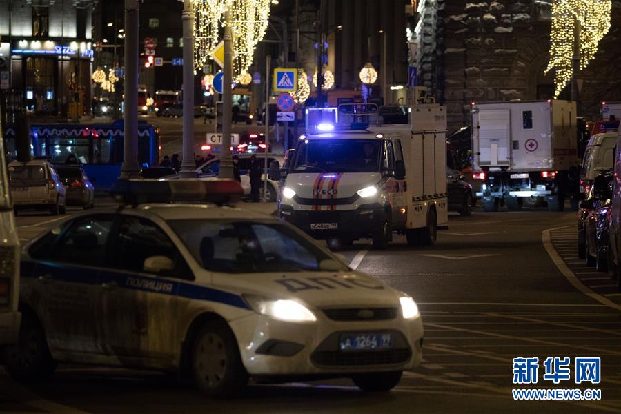 12月19日,在俄罗斯首都莫斯科,警车在枪击案现场附近待命。新华社记者 白雪骐 摄