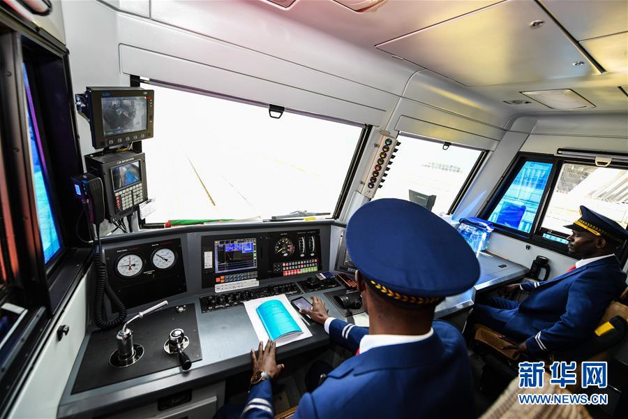 12月17日,在肯尼亚首都内罗毕,列车司机在驾驶室内为内马铁路一期货运通车做准备。新华社记者 李琰 摄