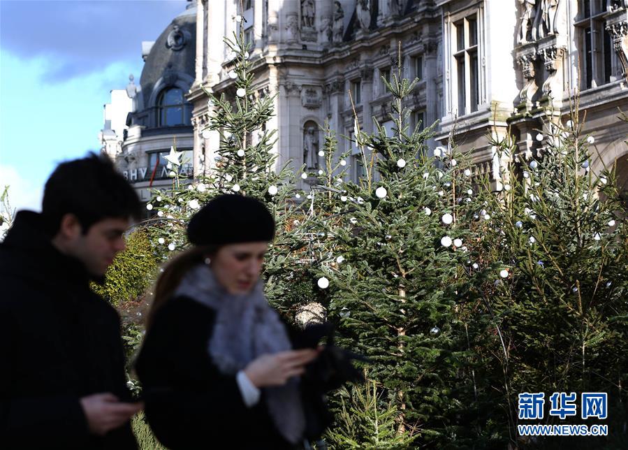 12月20日,在法国巴黎,人们经过市政厅广场上的圣诞树。圣诞将至,法国巴黎市政厅广场上数十棵造型各异、装饰华丽的圣诞树形成一片圣诞“树林”。新华社记者 高静 摄