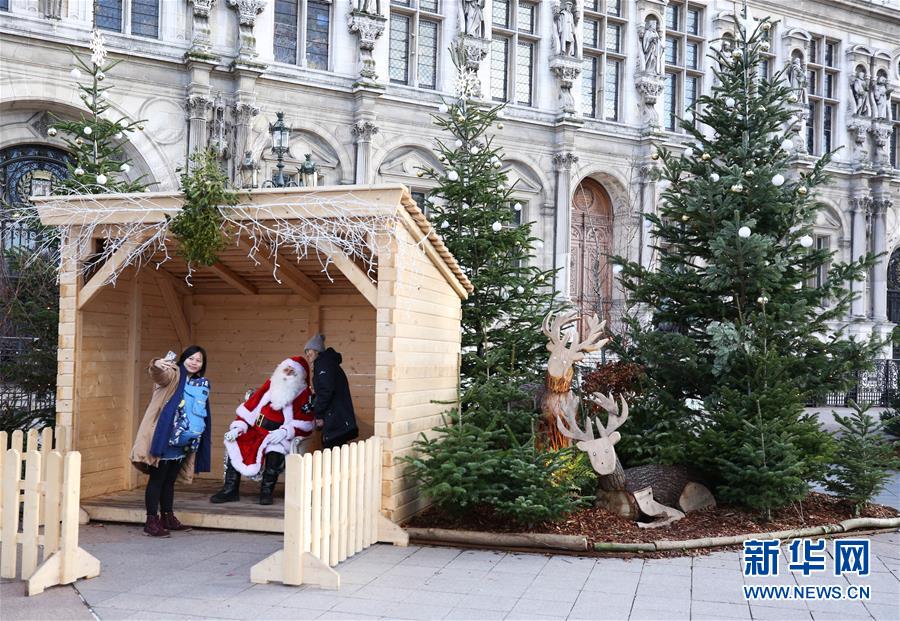 12月20日,在法国巴黎,人们在市政厅广场上拍照。圣诞将至,法国巴黎市政厅广场上数十棵造型各异、装饰华丽的圣诞树形成一片圣诞“树林”。新华社记者 高静 摄