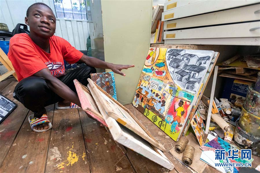 12月20日,在肯尼亚内罗毕库奥纳艺术中心,一名画家介绍自己的作品。 成立于1995年的库奥纳艺术中心位于肯尼亚首都内罗毕市区,目前有17间雕塑、绘画等艺术工作室。中心不定期举办艺术展览活动,园区内陈列有各类涂鸦墙及装置艺术作品。 新华社记者 王腾 摄
