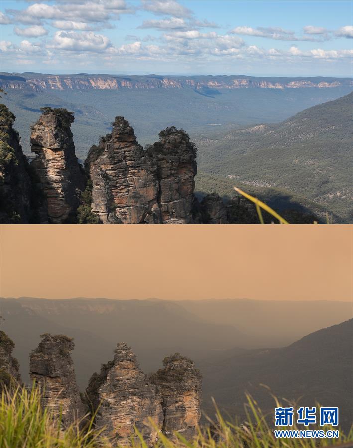 上图为2019年5月15日拍摄的澳大利亚新南威尔士州蓝山三姐妹峰;下图为2019年12月21日,澳大利亚新南威尔士州蓝山三姐妹峰被山火燃烧引发的烟雾笼罩(拼版照片)。 澳大利亚人口最多的新南威尔士州19日再次因林火肆虐宣布进入紧急状态,当晚,两名澳大利亚志愿消防员在扑救林火时殉职。 新华社记者 白雪飞 摄