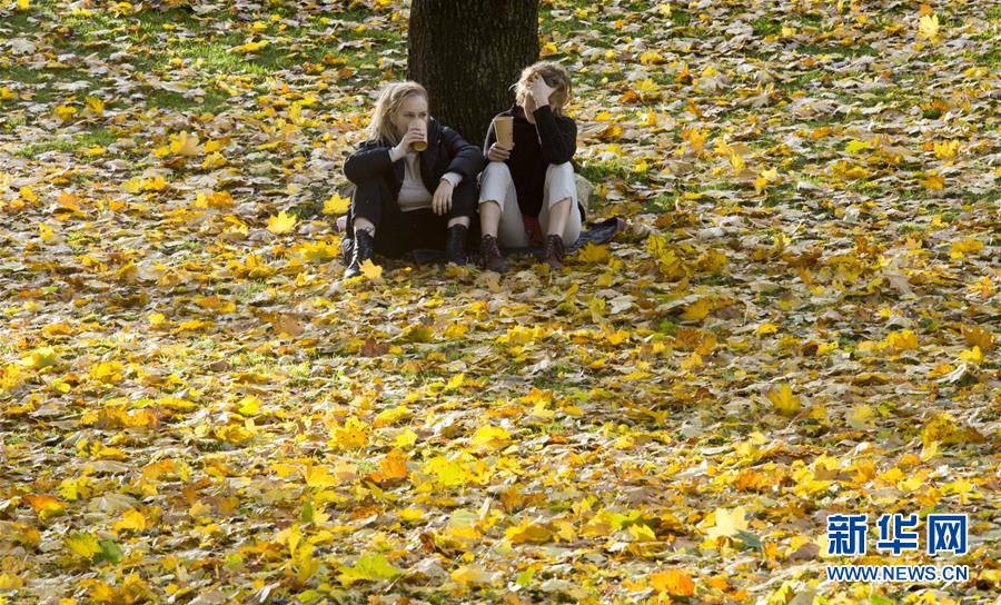 2019年10月14日,在拉脱维亚首都里加,两名女子坐在树下喝咖啡。 新华社发(艾迪斯摄)