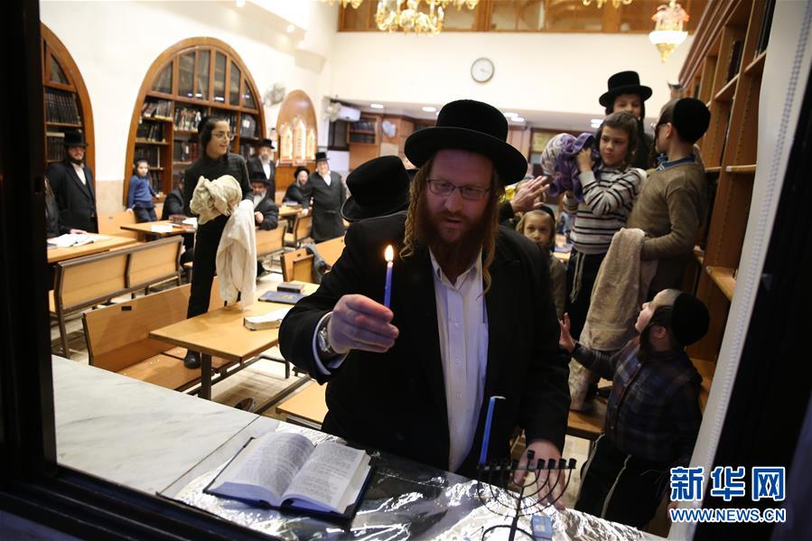 12月22日,在以色列采法特,一名犹太人点燃哈努卡节烛台上的蜡烛。 新华社/基尼图片社