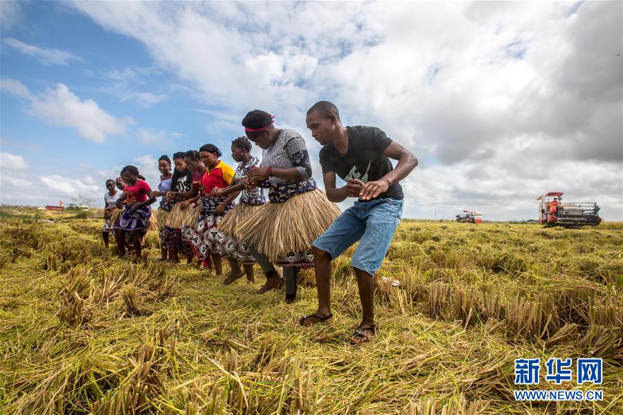 4月7日,在莫桑比克万宝莫桑农业园,农户在水稻收割现场载歌载舞庆祝丰收。新华社记者 张宇 摄