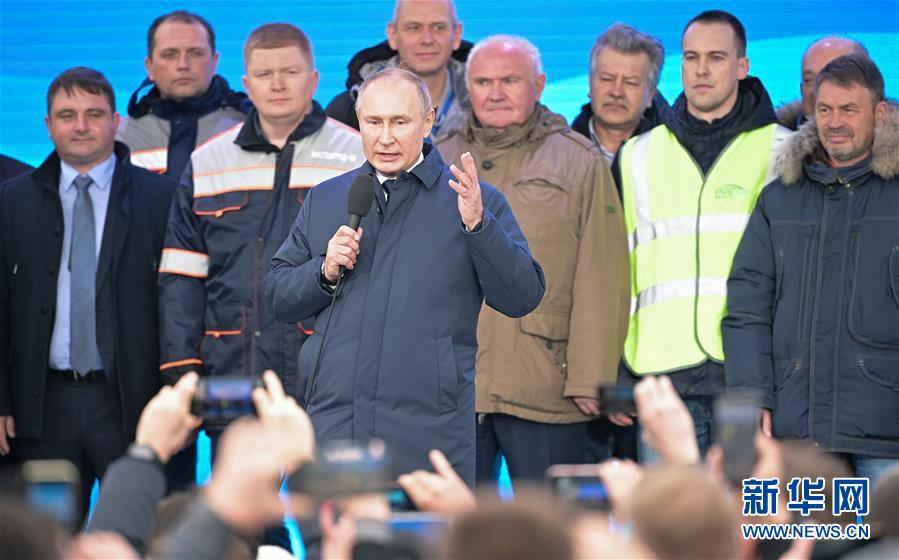 12月23日,在俄罗斯克拉斯诺达尔边疆区塔曼半岛,俄罗斯总统普京(前)在连接克里米亚半岛和俄克拉斯诺达尔边疆区的克里米亚大桥铁路桥开通仪式上发表讲话。俄罗斯总统普京23日出席了连接克里米亚半岛和俄克拉斯诺达尔边疆区的克里米亚大桥铁路桥开通仪式。新华社/卫星社