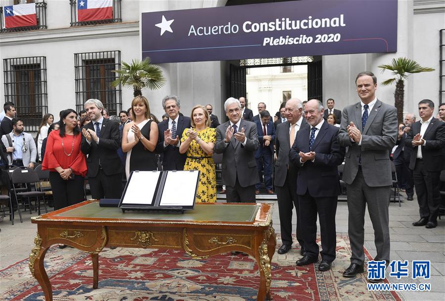 12月23日,在智利首都圣地亚哥总统府,智利总统皮涅拉(右四)在总统府签署了宪法修正案。 智利总统皮涅拉23日在总统府签署宪法修正案,确定于明年4月26日举行修宪公投。 智利现行宪法于1981年皮诺切特统治时期生效。10月中旬,智利首都圣地亚哥公交系统票价上涨引发了波及全国的抗议和骚乱。抗议民众要求修改宪法,以提高民众福利水平、促进社会平等和公正、减少过度私有化现象。 新华社发(智利总统府供图)