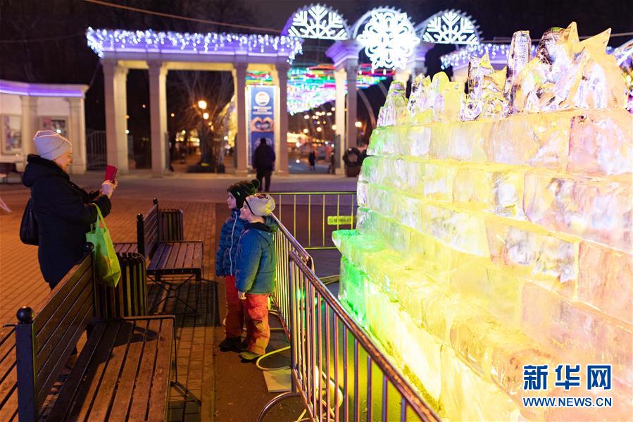 12月24日,在俄罗斯首都莫斯科,小朋友们与冰雕合影。 哈尔滨冰雕艺术展24日在莫斯科开幕,现场展出了哈尔滨大剧院、防洪纪念塔以及莫斯科红场建筑群等惟妙惟肖的冰雕作品,吸引众多游客驻足拍照。 参加本次冰雕艺术展的十名冰雕师提前抵达莫斯科,以新中国成立70周年、中俄建交70周年、“一带一路”倡议等为主题,为莫斯科民众奉上了精美的新年礼物。 新华社记者 白雪骐 摄