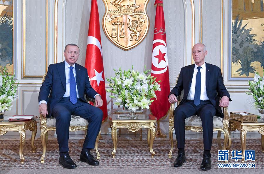 12月25日,突尼斯总统赛义德(右)在总统府会见来访的土耳其总统埃尔多安。 当日,突尼斯总统赛义德会见来访的土耳其总统埃尔多安,双方就利比亚冲突各方如何尽快达成停火、停止冲突交换了意见。 新华社发(突尼斯总统府供稿)