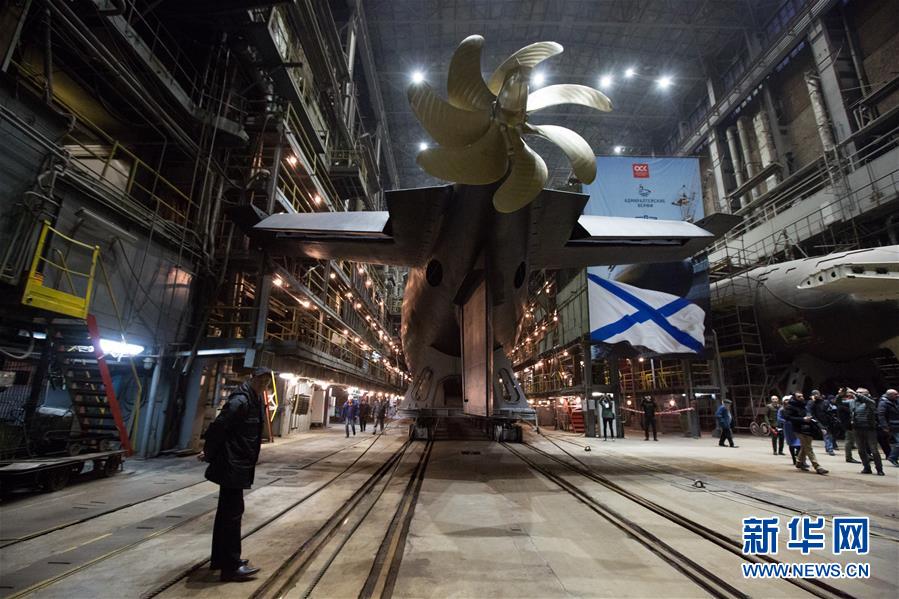 12月26日,“沃尔霍夫”号潜艇在俄罗斯圣彼得堡海军部造船厂准备下水。 新华社发(莫京娜摄)