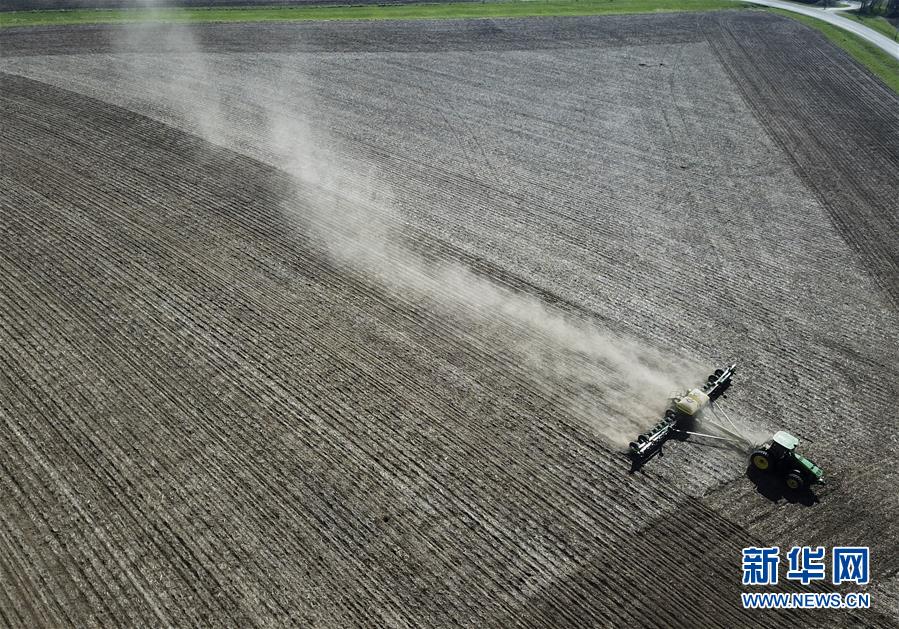 4月24日,在美国艾奥瓦州大西洋镇,一台播种机在比尔·佩雷特的农场进行作业(航拍照片)。 新华社发