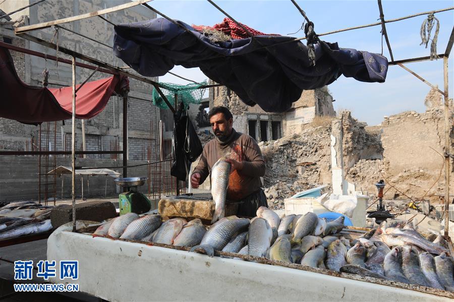 12月23日,在伊拉克摩苏尔,一名商贩在阿塔林市场外卖鱼。新华社发(哈利勒·达伍德摄)