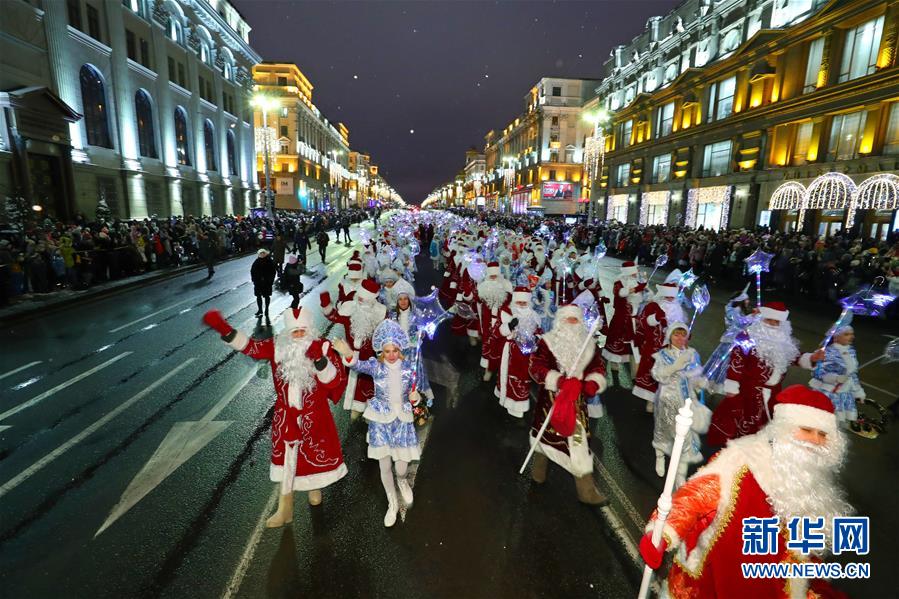 12月28日,在白俄罗斯首都明斯克,人们装扮成“严寒老人”和“雪姑娘”参加新年巡游。 当晚,近千人在明斯克参加巡游,迎接即将到来的新年。 新华社发(任科夫 摄)