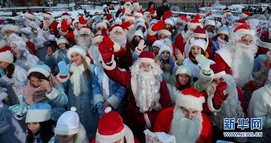 12月28日,在白俄罗斯首都明斯克,人们装扮成“严寒老人”和“雪姑娘”参加新年巡游。 当晚,近千人在明斯克参加巡游,迎接即将到来的新年。 新华社发(任科夫 摄)