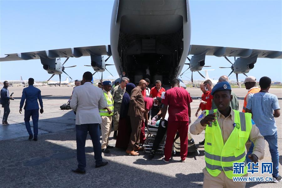 12月29日,在索马里首都摩加迪沙的机场,医务人员帮助伤者登机。索马里首都摩加迪沙一处公路检查站28日清晨遭自杀式汽车炸弹袭击,已造成79人死亡。此次袭击事件是自2017年10月以来索马里发生的最严重的袭击事件。新华社发(哈桑·巴希 摄)