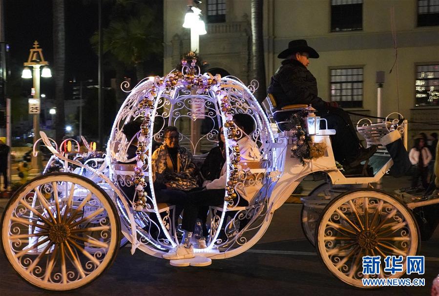 12月29日,人们在美国加利福尼亚州里弗赛德灯光节上乘坐马车。 第27届里弗赛德灯光节流光璀璨,洋溢着浓厚的新年气氛,吸引众多游客前来观看。 新华社记者李颖摄