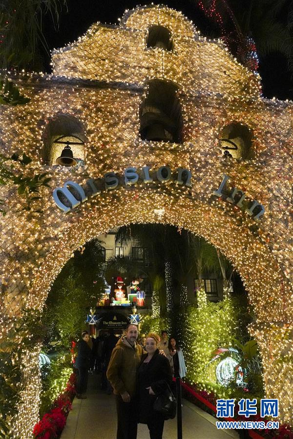 12月29日,人们在美国加利福尼亚州里弗赛德灯光节上拍照留念。 第27届里弗赛德灯光节流光璀璨,洋溢着浓厚的新年气氛,吸引众多游客前来观看。 新华社记者李颖摄