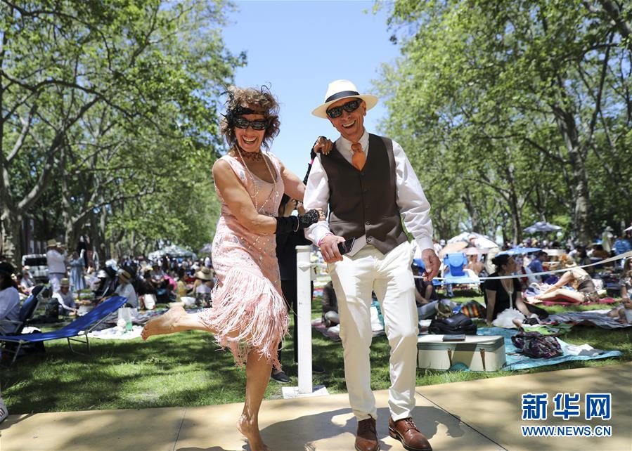 6月15日,人们在美国纽约举行“爵士时代草坪派对”上跳舞。当日,第14届“爵士时代草坪派对”在纽约市总督岛举行,上千名参与者身着复古服饰,享受“时光倒流”的别样乐趣。