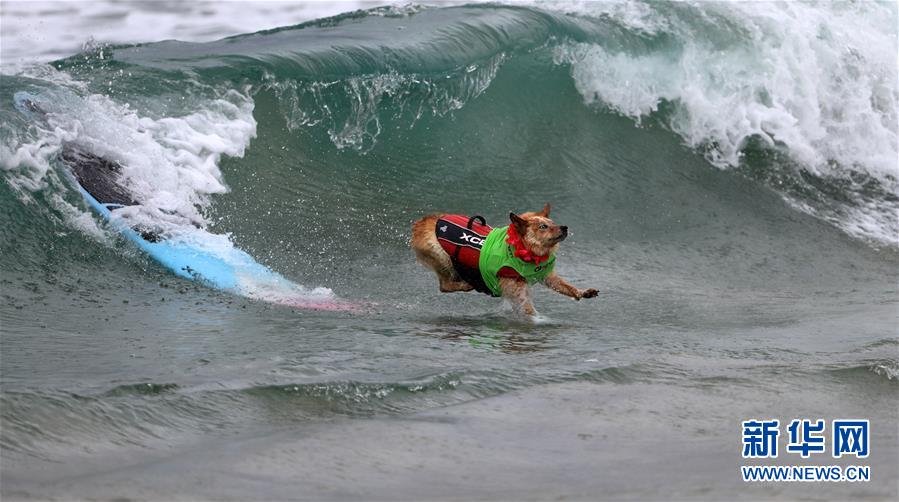9月28日,在美国加利福利亚州亨廷顿海滩举行的狗狗冲浪大赛中,一只小狗乘风破浪。
