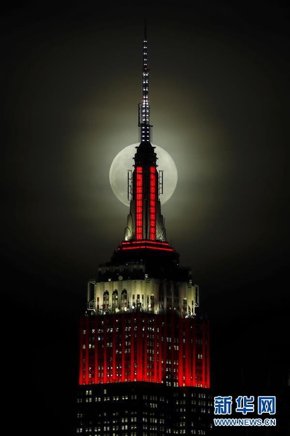 这是2月19日在美国新泽西州霍博肯拍摄的月亮从帝国大厦上空升起的景象。当日,年度“最大最圆月”现身天宇,为人们元宵赏月平添情趣。