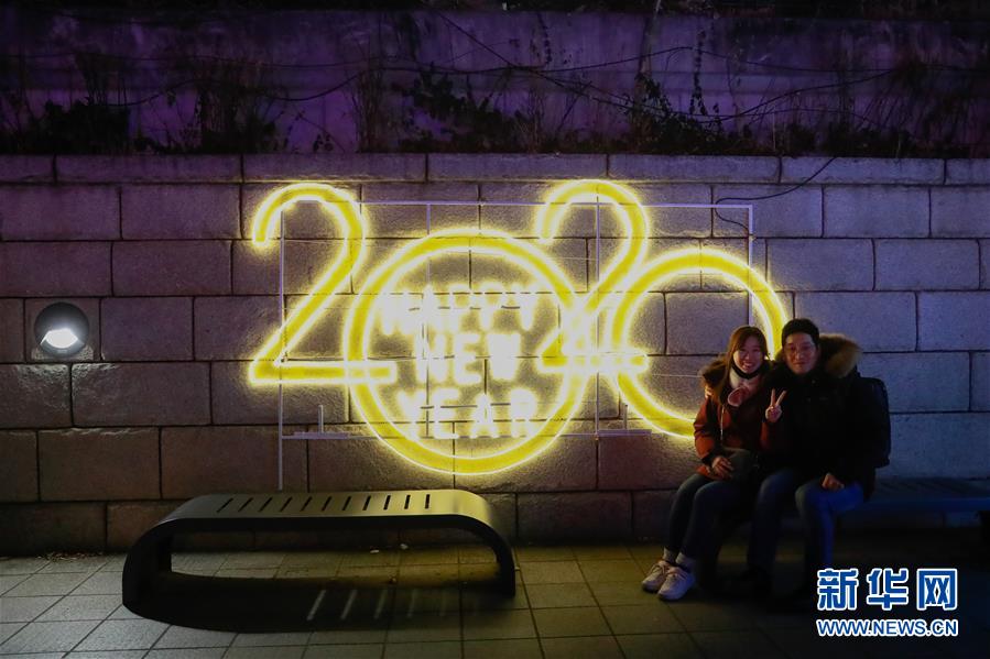 2020年1月1日,一对情侣在韩国首尔的清溪川灯节留影。 新华社记者王婧嫱摄