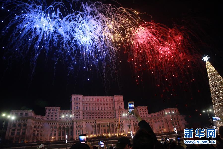 1月1日,焰火在罗马尼亚布加勒斯特上空绽放,迎接新年到来。 新华社发(彼得雷斯库摄)
