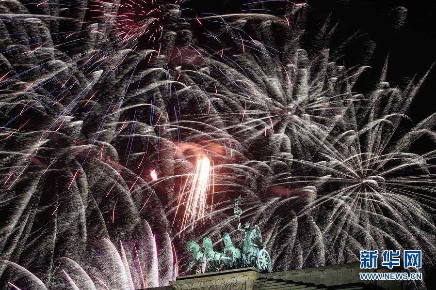 1月1日,焰火在德国首都柏林的勃兰登堡门上空绽放,庆祝新年到来。 新华社记者 单宇琦 摄