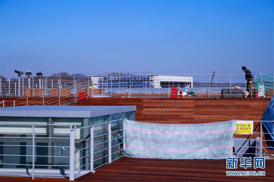 2019年12月20日,工人在位于韩国京畿道坡州市北部的临津阁和平公园内进行修缮维护工作。新华社记者 王婧嫱 摄