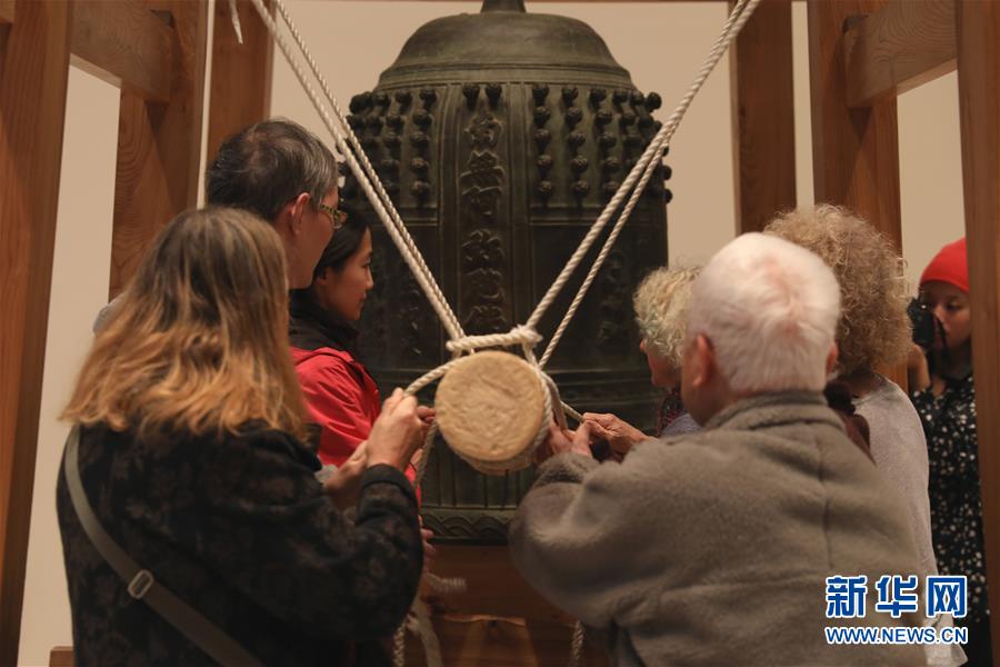 2019年12月31日,在美国旧金山亚洲艺术博物馆,人们在敲钟。当日,美国旧金山亚洲艺术博物馆举行敲钟仪式,迎接新年的到来。 新华社发(刘艺霖摄)