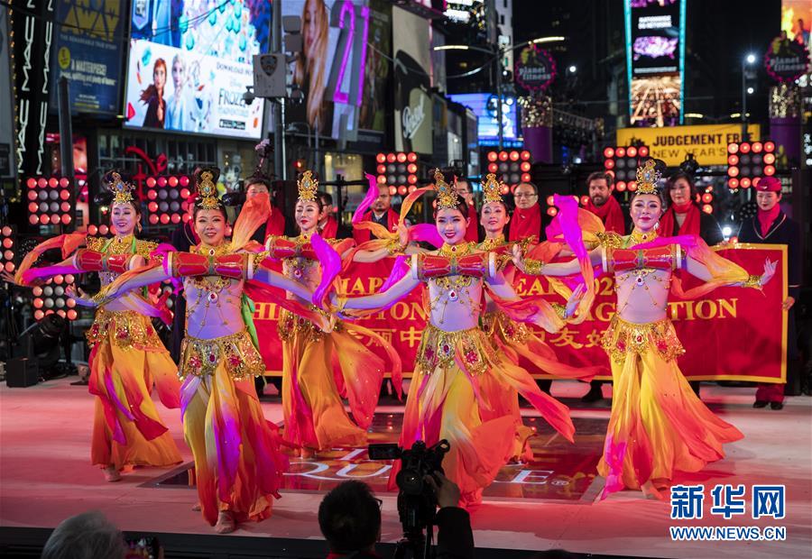 2019年12月31日,在美国纽约时报广场举行的跨年庆祝活动开幕式上,演员表演中国特色舞蹈。当日,纽约时报广场举行一年一度的跨年庆祝活动。 新华社记者 王迎 摄