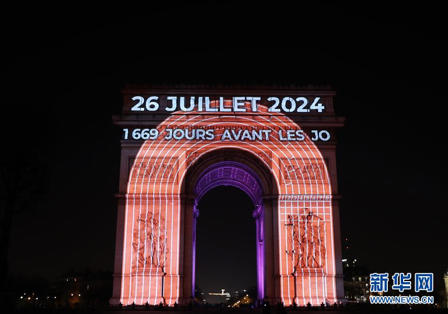 这是2019年12月31日在法国巴黎凯旋门拍摄的声光秀表演。新华社记者 高静 摄