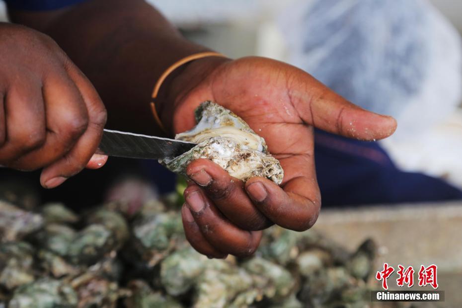 莫桑比克濒临印度洋,气候和洋流条件适合海洋生物生长,因此渔业种类丰富。图为摊贩现场撬开牡蛎。中新社记者 王曦 摄