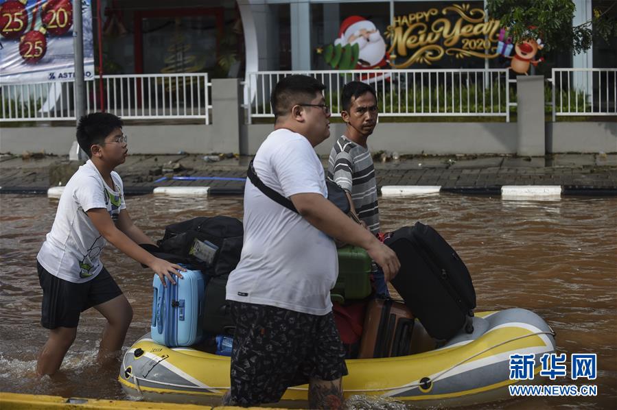 1月2日,在印度尼西亚雅加达,人们用橡皮艇转移物资。 新华社发(阿贡摄)