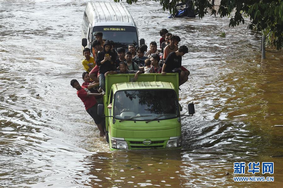 1月2日,在印度尼西亚雅加达,人们乘车通过积水路段。 新华社发(阿贡摄)