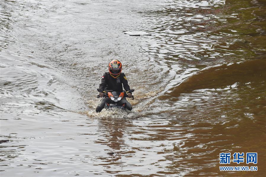 新1月2日,在印度尼西亚雅加达,一名男子骑摩托车通过积水路段。新华社发(阿贡摄)
