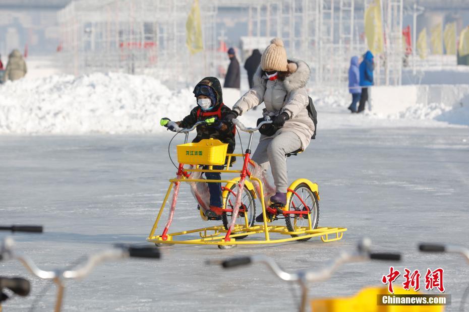 1月2日,一场“时尚冰河”巡游秀在黑龙江省哈尔滨市松花江冰雪嘉年华景区举行。中外游客在严寒中体验冰爬犁、冰滑梯、冰雪气垫船等冰雪娱乐项目。图为游客体验冰上自行车。中新社记者 吕品 摄
