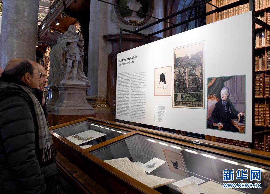 1月3日,在奥地利维也纳的奥地利国家图书馆内,人们参观“贝多芬,人的世界和众神的火花”展览。新华社记者郭晨摄
