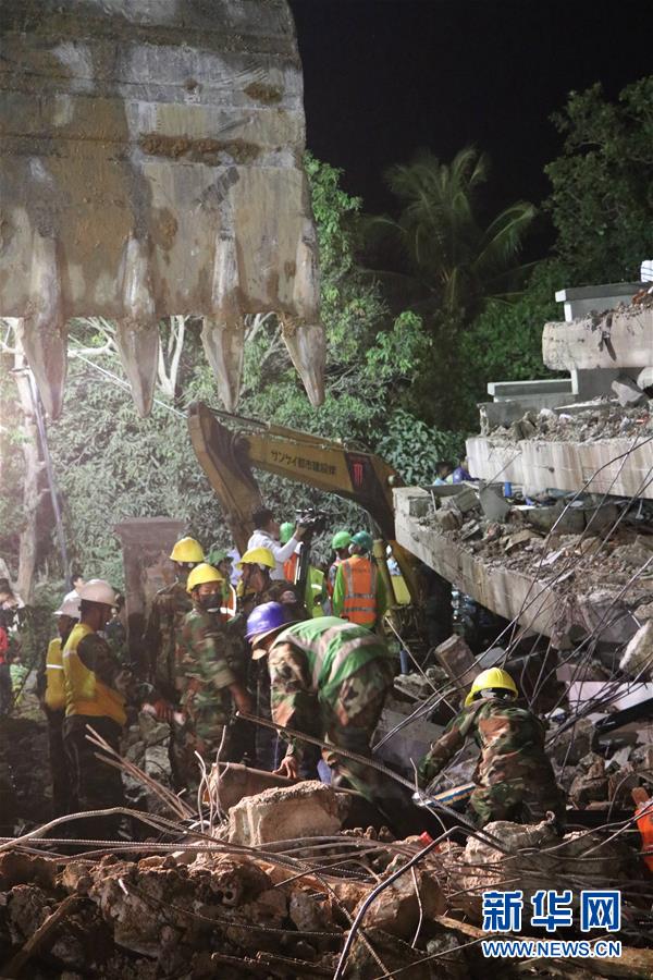 1月4日,在柬埔寨白马市,救援人员在楼房坍塌事故现场工作。 新华社记者毛鹏飞摄