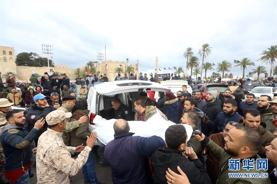 1月5日,在利比亚首都的黎波里,人们参加空袭遇难学生哀悼仪式。 利比亚卫生部门发表声明说,4日发生在的黎波里一军事学院的空袭造成30名学生死亡、33人受伤。 新华社发(哈姆扎·图尔基亚 摄)