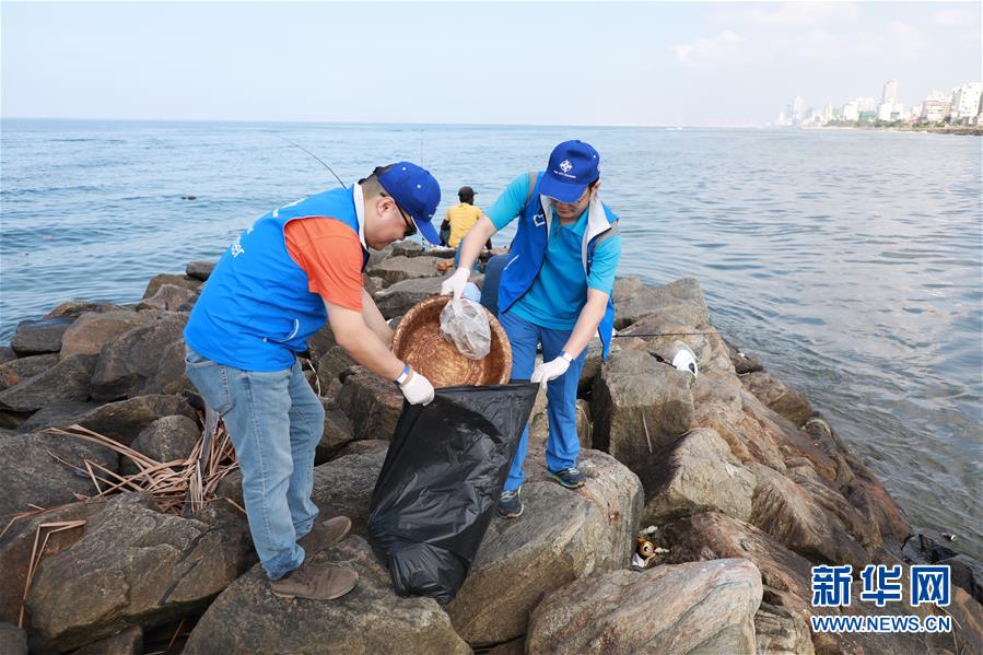 1月4日,在斯里兰卡科伦坡附近的芒特拉维尼亚公共海滩,两名志愿者在礁石上清理废弃物。新华社发(林盛伟摄)