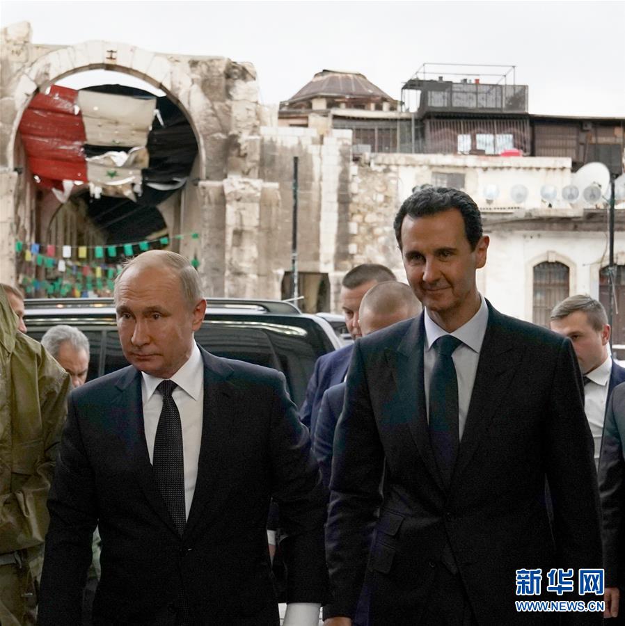 1月7日,在叙利亚首都大马士革,俄罗斯总统普京(前左)与叙利亚总统巴沙尔(前右)参观倭马亚清真寺。新华社发(叙利亚总统府供图)