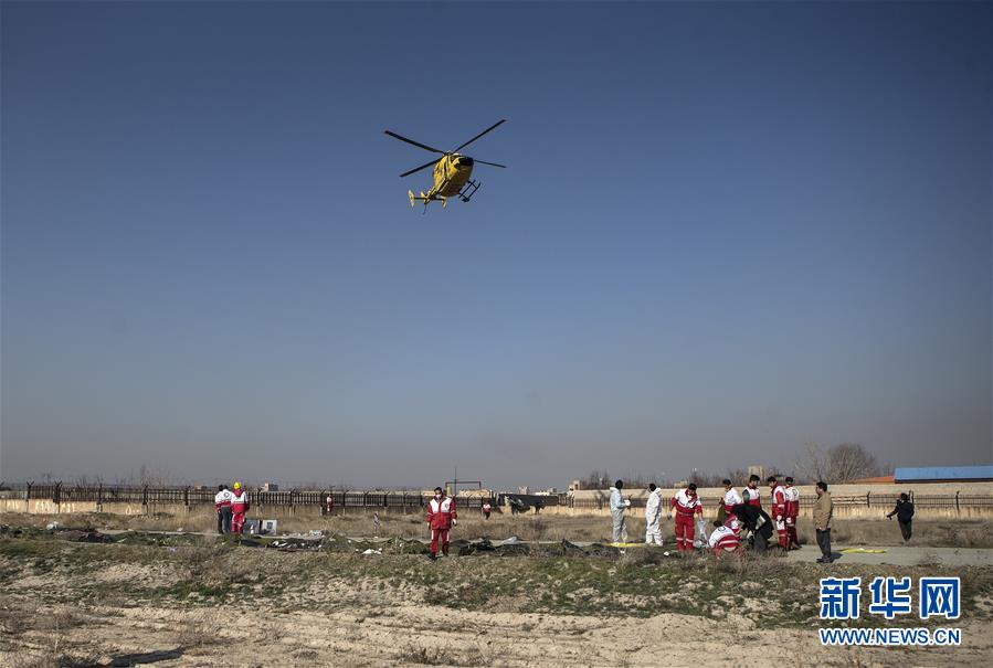 1月8日,在伊朗德黑兰霍梅尼国际机场附近,直升机在坠机现场上空盘旋。新华社发(艾哈迈德·哈拉比萨斯摄)