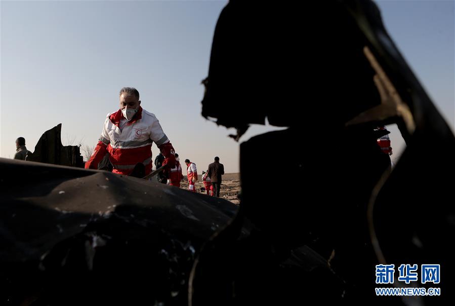 1月8日,在伊朗德黑兰霍梅尼国际机场附近,救援人员在坠机现场工作。 新华社发(伊斯兰共和国通讯社供图)