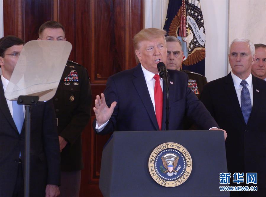 1月8日,美国总统特朗普(中)在华盛顿白宫发表电视讲话。 美国总统特朗普8日说,伊朗对驻有美军的伊拉克军事基地发动的袭击未造成美方人员伤亡,美方将立即对伊朗实施新的经济制裁。 新华社记者 胡友松 摄