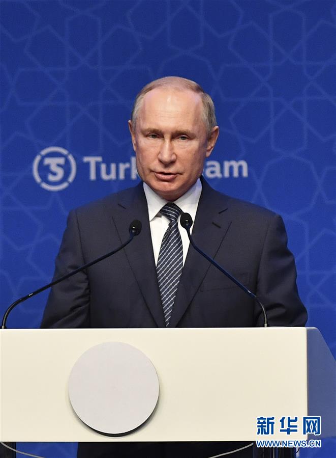1月8日,在土耳其伊斯坦布尔,俄罗斯总统普京在“土耳其溪”天然气管道通气仪式上发言。新华社记者 徐速绘 摄